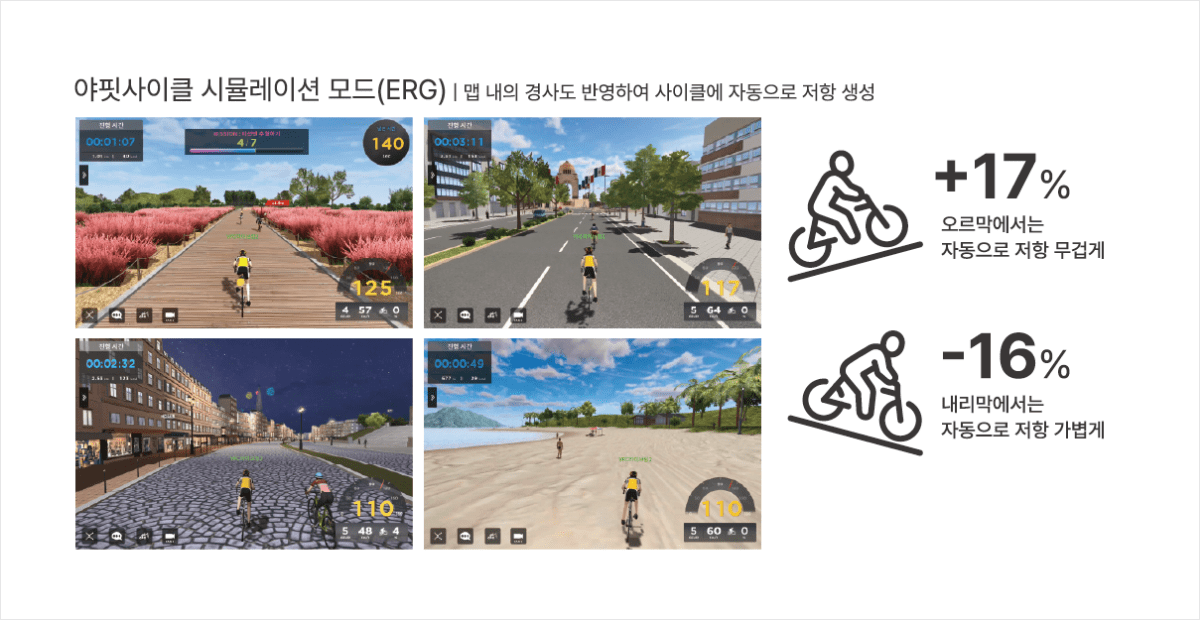 자전거 10분을 타더라도 야핏사이클, 야핏좌식바이크의 경우 메타버스 맵상의 경사도가 그대로 패달의 저항에 반영됩니다. 실내에서 자전거를 타지만 야외에서 타는 것과 동일하게 경사도에 반응한 다양한 페달저항으로 여러 부위의 근육을 강화 할 수 있고, 다른 사이클 대비 동시간에 더 많은 칼로리 소모와 재미를 잡을수 있습니다.