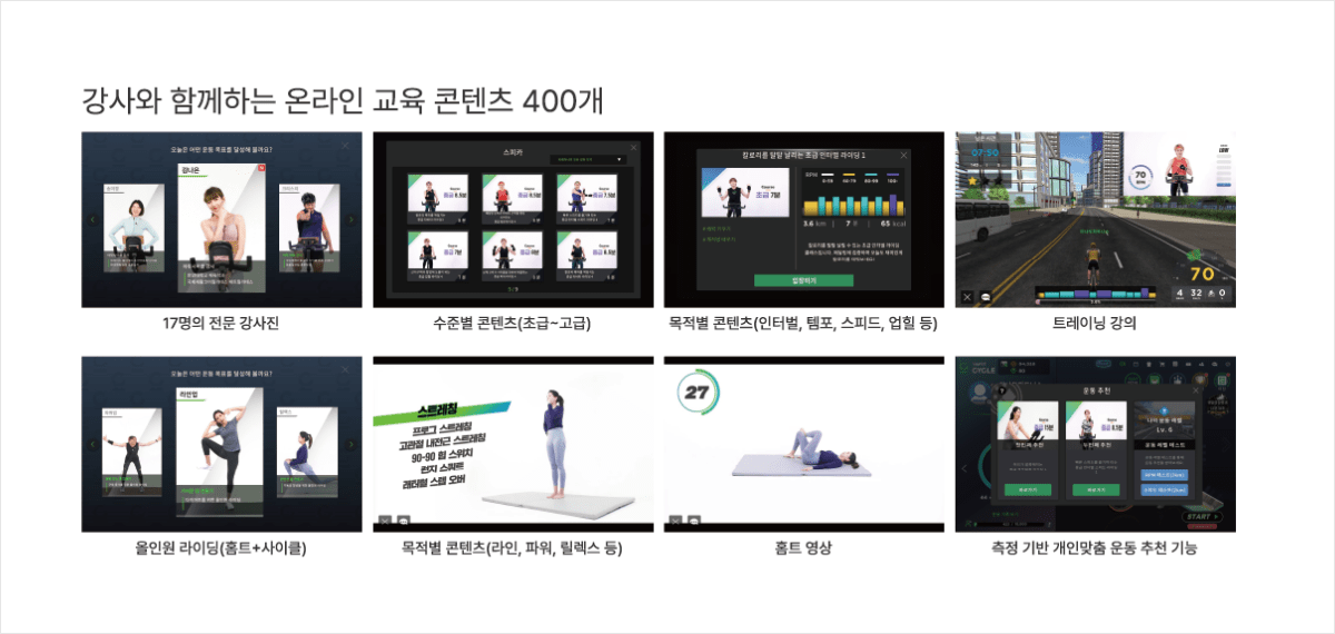 17명의 전문 강사가 초급부터 고급까지 수준별 콘텐츠와, 인터벌, 템포, 스피드, 업힐등 훈련 목적별 트레이닝 등 총 500강 동영상 콘테츠가 제공되어서, 이용자가 영상을 보며 운동을 마무리 할 수 있습니다.