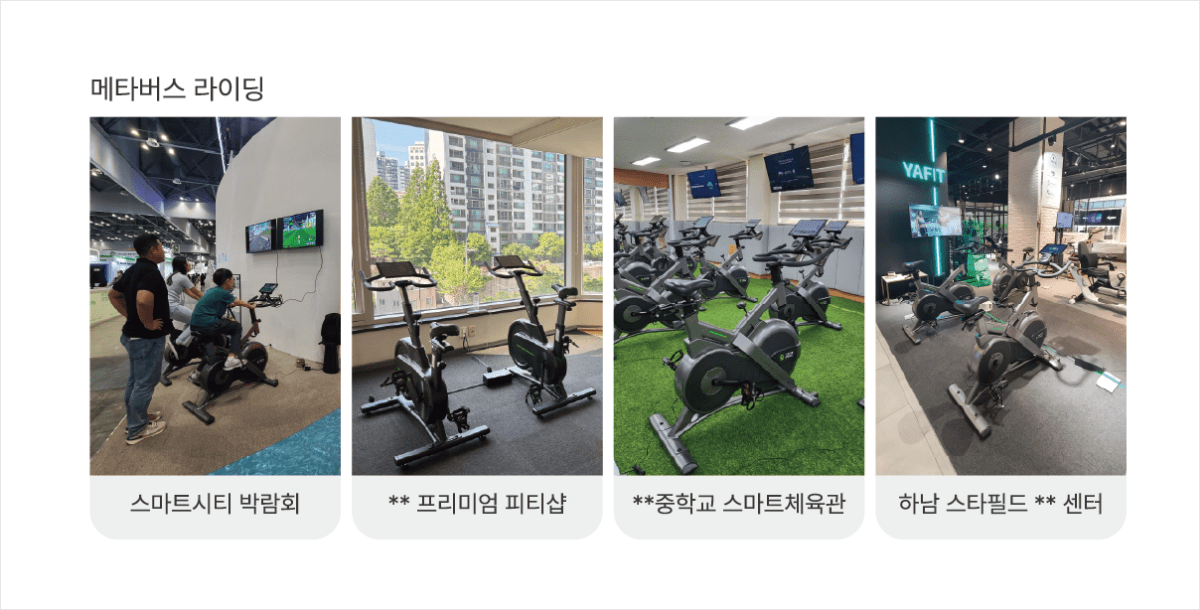 야핏사이클과 야핏좌식바이크가 설치된 전국 모든 피트니스센터와 학교, 건강증진센터 등의 이용자가 동시에 메타버스에 접속하여 대회를 열수 있습니다.