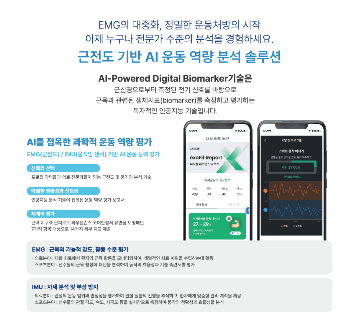 근전도 기반 AI 운동 역량 분석 솔루션 AI-Powered Digital Biomarker 기술은 근신경으로부터 측정된 전기 신호를 바탕으로 근육과 관련된 생체지표(biomarker)를 측정하고 평가하는 독자적인 인공지능 기술입니다.