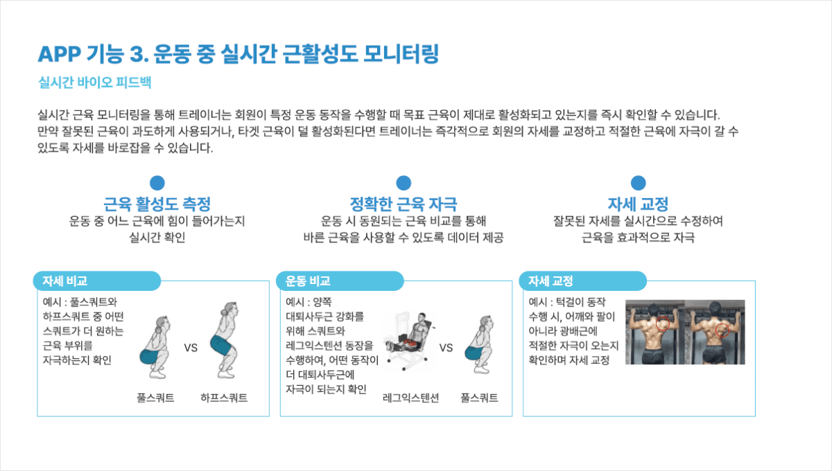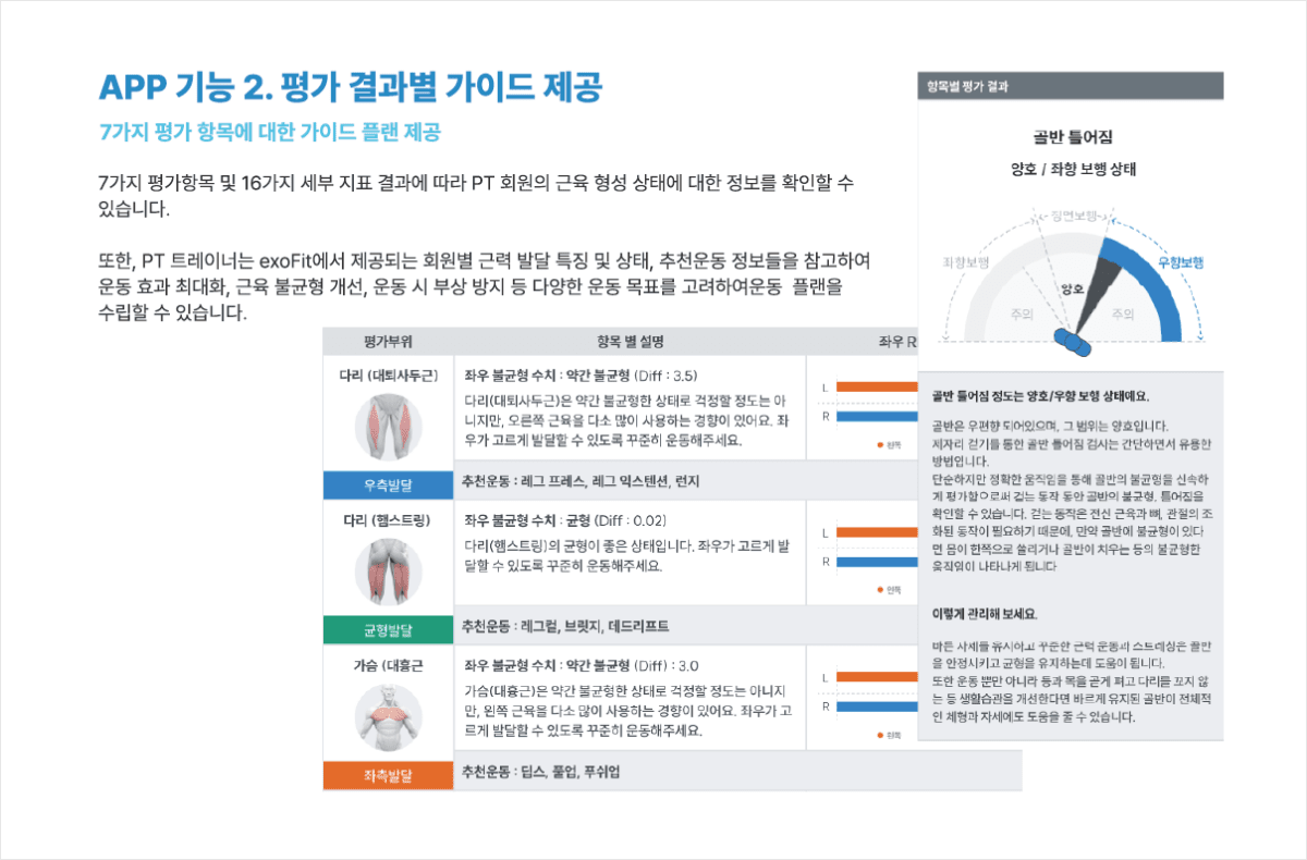 근육의 활동을 평가하고 분석하는 근전도 측정 기술은 국가대표선수들의 훈련, 경기력 향상, 부상 예방 등에 사용됩니다. 이러한 근전도 기술과 엑소시스템즈만의 근육 분석기술을 개인 PT 고객에게 적용하여 근육 상태 분석과 운동능력을 평가하고 개인에 맞는 정밀 맞춤형 커리큘럼을 개발합니다.